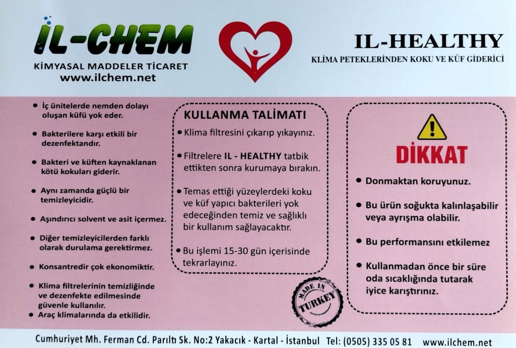 Klima filtresini çıkarıp, üzerinde biriken kirliliği yıkayarak uzaklaştırınız. Filtrelere İL- HEALTY tatbik ettikten sonra kurumaya bırakınız. Klima iç ünitesindeki alüminyum peteklerin yüzeyine en derin noktalara nüfuz edecek şekilde İL- HEALTY püskürterek temizleyiniz. İL- HEALTY temas ettiği yüzeylerdeki koku ve küf yapıcı bakterileri yok edeceğinden temiz ve sağlıklı bir kullanım sağlayacaktır. Bu işlemi yeniden bakteri oluşumuna izin vermeden 15 veya 30 gün içerisinde tekrarlayınız.